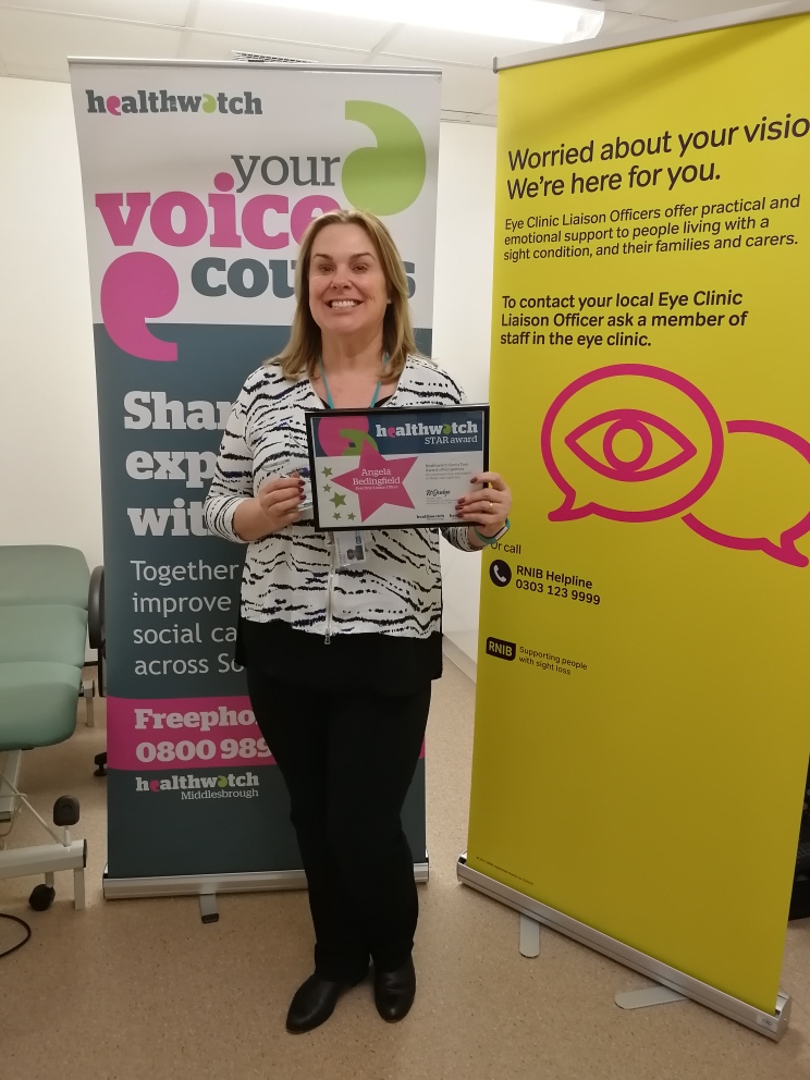As a Healthwatch we think it is important to share good practice - learning from the best can only help to improve services. To this end, we have introduced the Healthwatch South Tees Award of Recognition (STAR Award). Our very first recipient is Angela Bedingfield, the Eye Clinic Liaison Officer at James Cook University Hospital. The Award recognises Angela’s continued care and support for those with sight loss. From the comments we received, Angela certainly deserves it and was delighted to receive it.